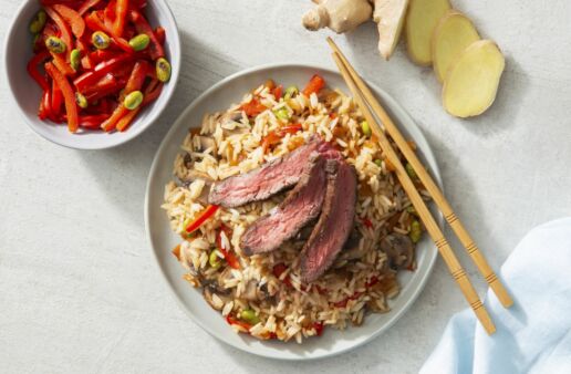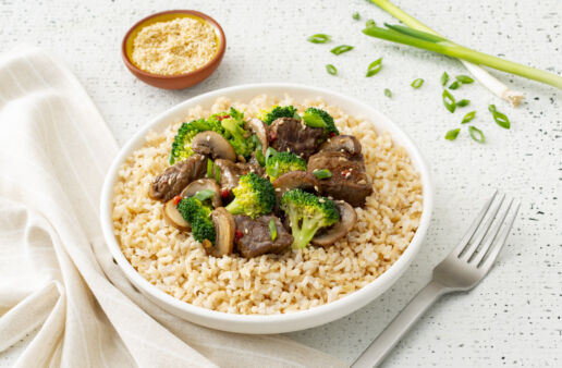 You’ll love this fast and easy Beef & Broccoli Stir-Fry made with brown rice, sirloin steak, broccoli florets, ginger, soy sauce and sliced mushrooms.